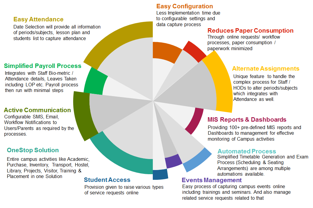 Our Solution comprises of 16 components which facilitates student, staff, administration and support services. All modules are tightly integrated with no data duplication anywhere, however every component is an independent solution to use as plugin based on customer requirement.