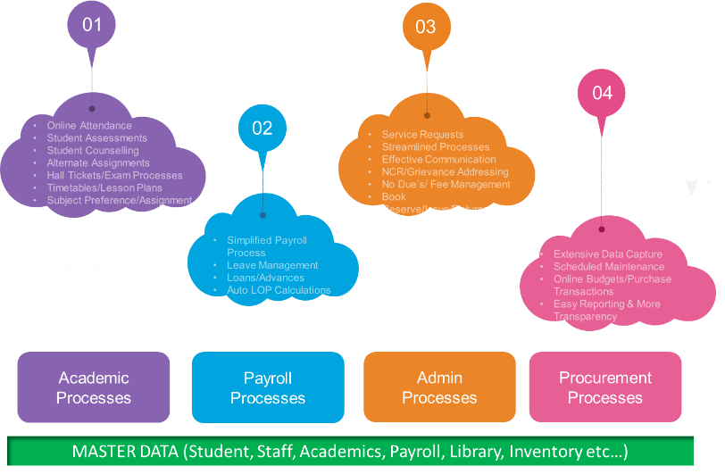 In the current socio-economic climate, the biggest challenge of the educational institutions (Schools/Colleges/Universities) is to efficiently manage Student Admissions, Staff Recruitments & Management, Single/Multiple Campuses, etc. It is a difficult, time taking task for the HODs and Management to keep track of the Student and Staff related processes such as Attendance, Time Table Schedules, Exam Scheduling, Seating Arrangements, Exam Process, Staff Work Allotment, Payroll, Library Management, Transportation Management, Research/Civil Projects Tracking, Visitor Management, Budgeting, Manage Inventory, Purchasing & GRNs etc.